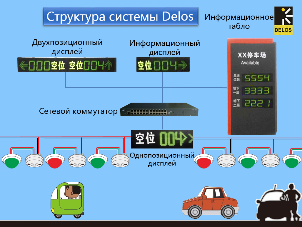 Системы управления движением на парковках Delos построены наиболее простым образом для максимальной эффективности без вмешательства человека и без применения дорогостоящего оборудования и программ: система работает автономно: не нужен сервер, дорогое ПО и какие-либо контроллеры.